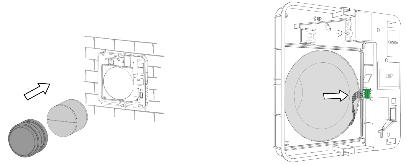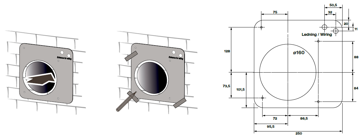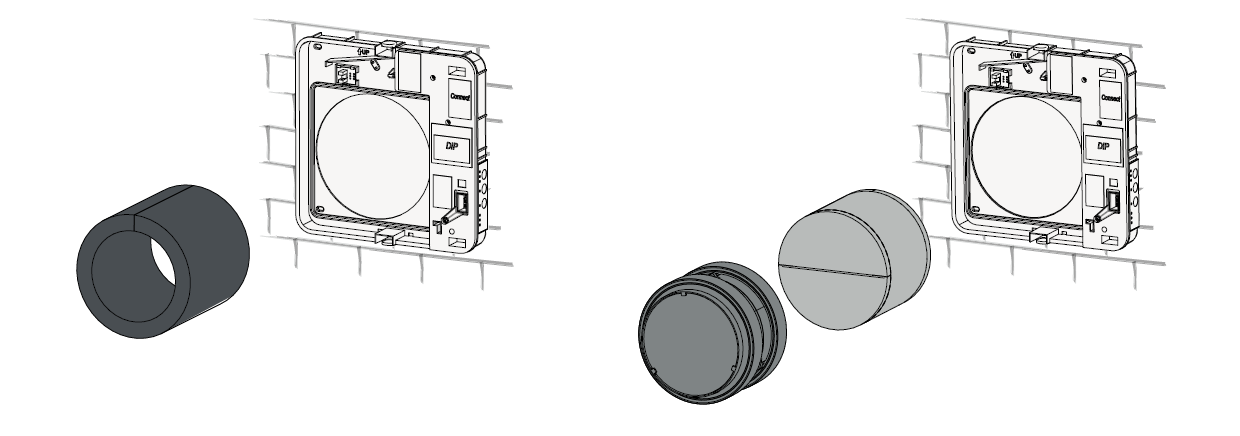 stormskjold og vegggjennomføring. På innsiden er elektronikkseksjonen med frontdeksel. I veggen sitter vegggjennomføringen der kjernen