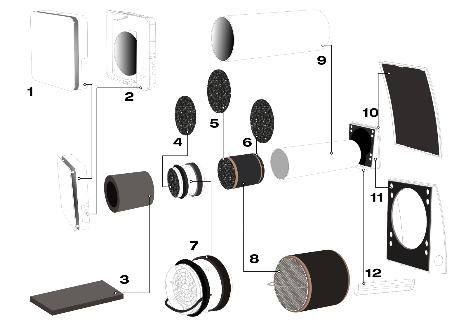 DUKA One-enheten består av frontdeksel, elektronikkdel, kjerne der den keramiske veksleren og motoren er plassert, lyddemper, filtre, dryppbrett,