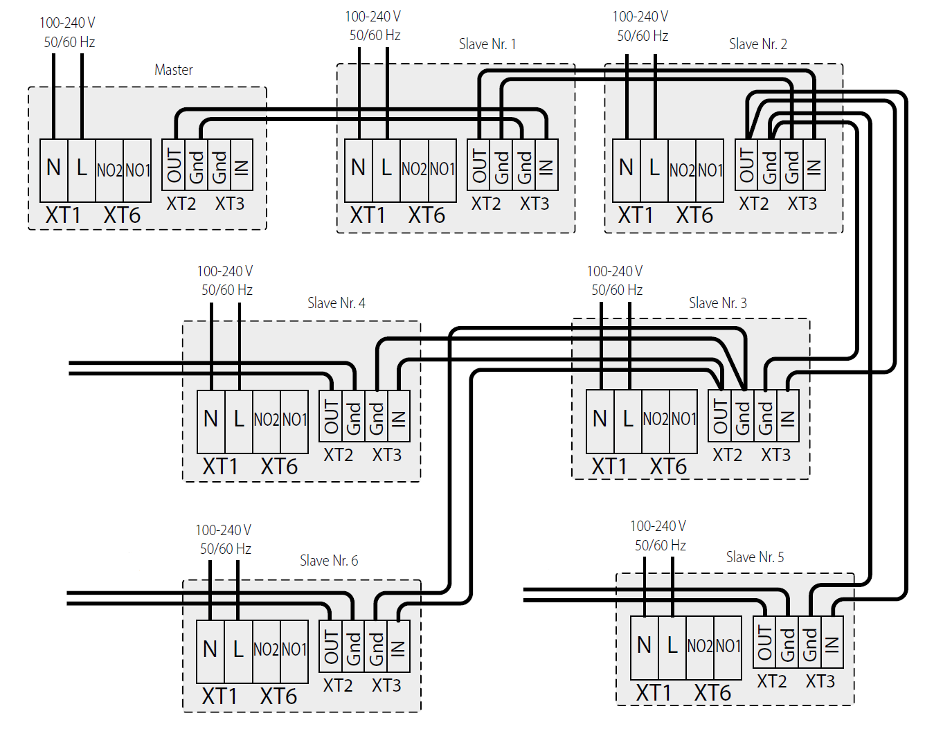 Hovedindikator | Bare masterenheten vil lyse når flere enheter er tilkoblet. Slaveenhetene vil ikke ha lys i indikatoren.Hvis indikatoren på en av slaveenhetene blinker, betyr det at det ikke er noen forbindelse til masterenheten. |