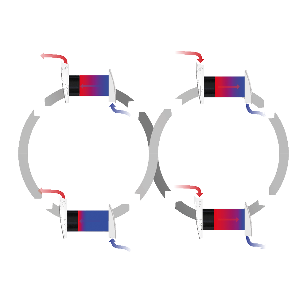 Enheten kan kjøre i enten ventilasjons- eller varmegjenvinningsmodus. I ventilasjonsmodus vil enheten ventilere én vei, avhengig av enhetens innstillinger. I varmegjenvinningsmodus trekker aggregatet ut luften fra boligen i 70 sekunder, der varmen fra avtrekksluften lagres i rammen. Deretter reverserer motoren og blåser inn i 70 sekunder, der tilluften varmes opp av den lagrede varmen i kjernen.