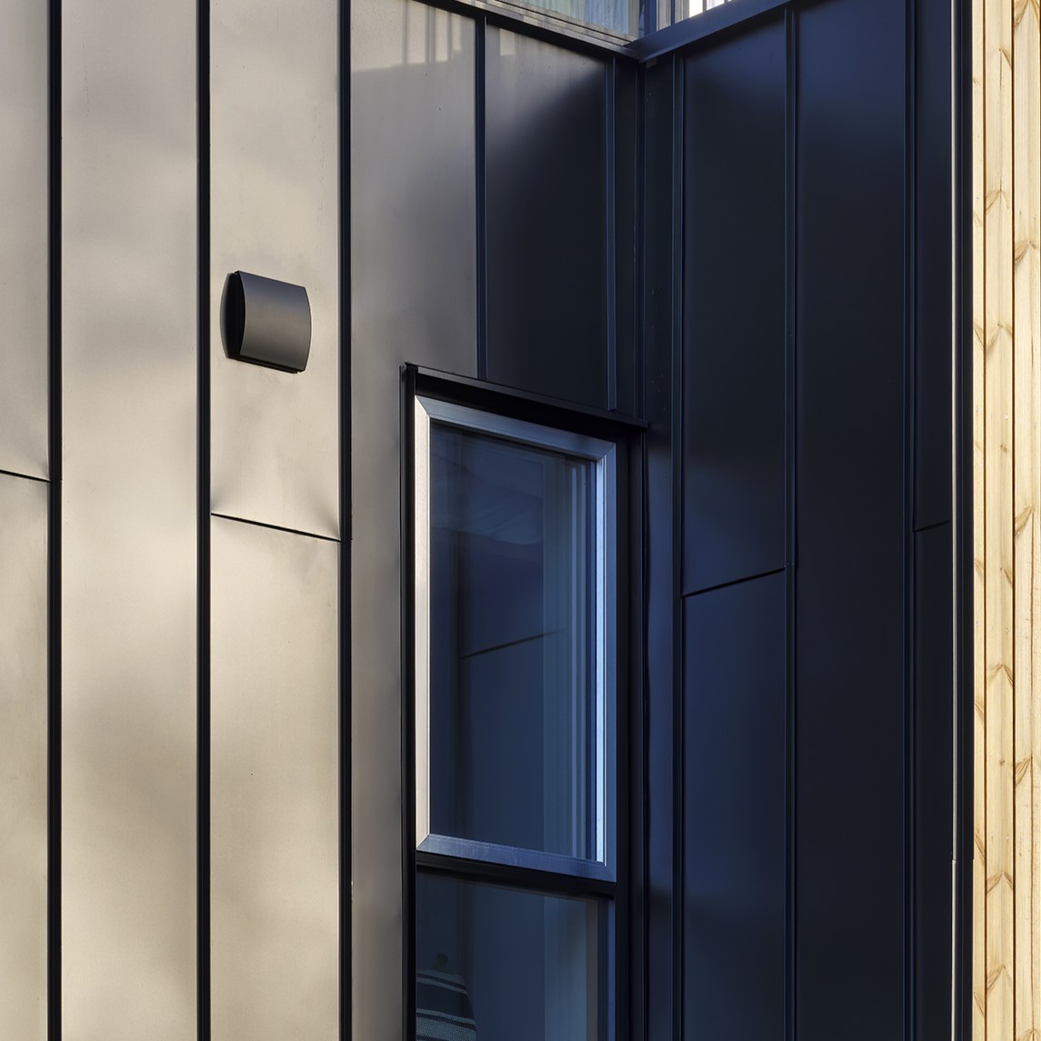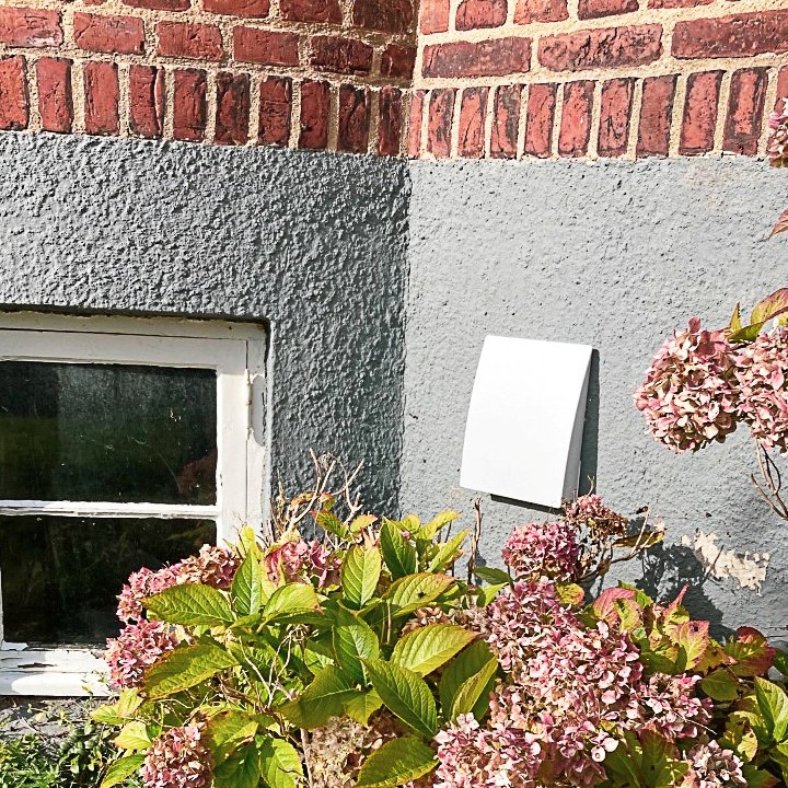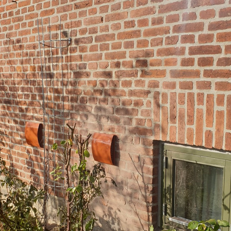 Løsningen består af en murgennemføring med keramisk veksler, udvendig stormskærm og indvendig skærm med lav-energi tovejs-ventilator.