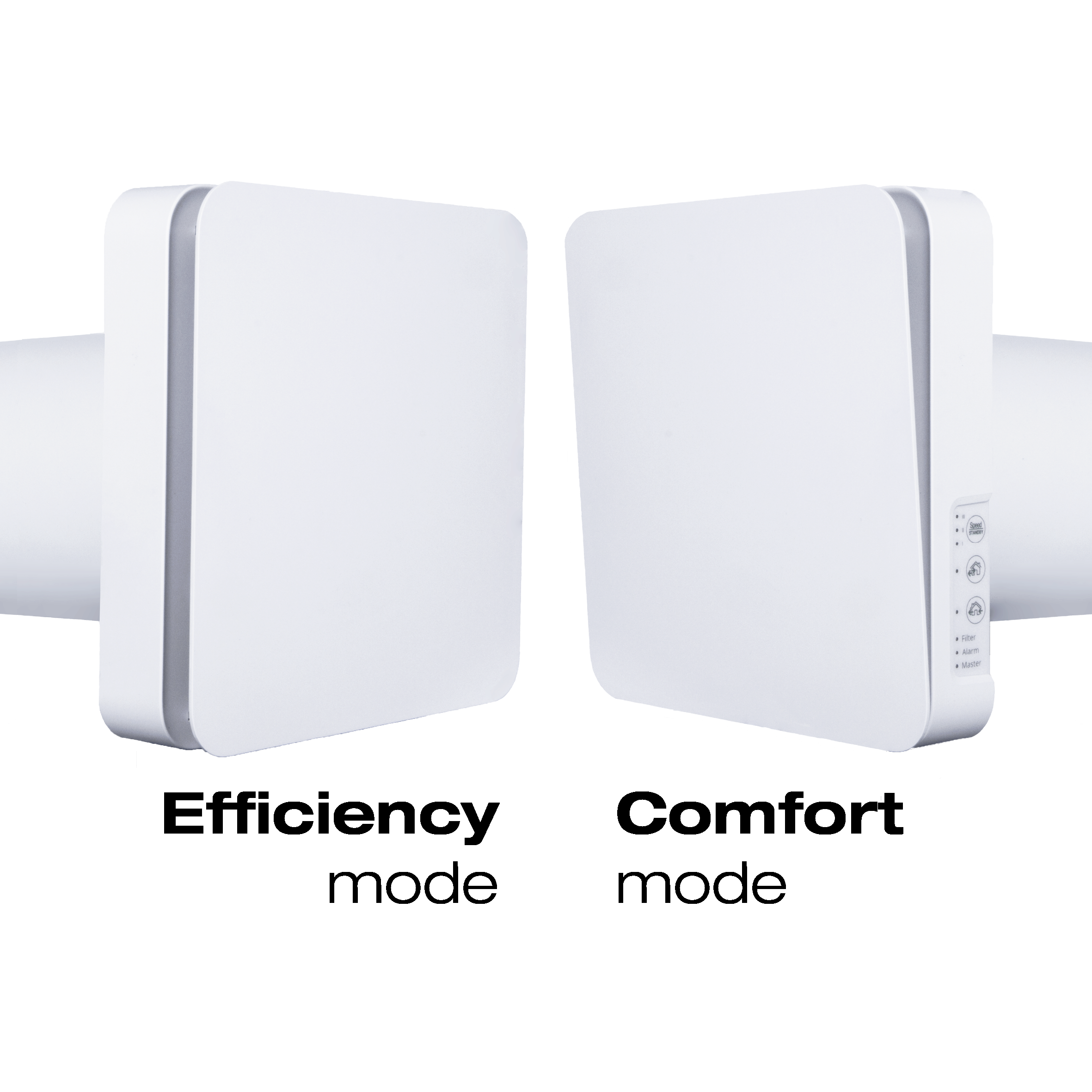 Derfor har vi utviklet en spesiell DUKA One-modell for våtrom i boliger. Når badet (eller andre våtrom) ikke er i bruk, sørger DUKA One-aggregatet for grunnventilasjon med varmegjenvinning. Enheten har en innebygd fuktighetssensor, og når den aktiveres, går enheten over til forcert drift med rent avtrekk på trinn III. Dette er viktig fordi fuktigheten fra baderommet ikke må flyttes til naborommene. Når luftfuktigheten igjen er under den innstilte grensen, går aggregatet tilbake til grunnventilasjon med varmegjenvinning.