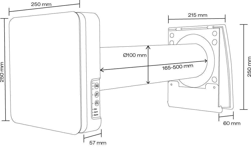 DUKA One Pro 25 B har en rørdiameter på 100 mm, noe som gjør enheten ideell for å føre opp en Ø105 mm eller 150 x 150 mm friskluftventil for en varmegjenvinningsløsning. Kjernen på DUKA One Pro 25 B er 165 mm, noe som gjør denne enheten ideell for fritidsboliger med tynnere vegger